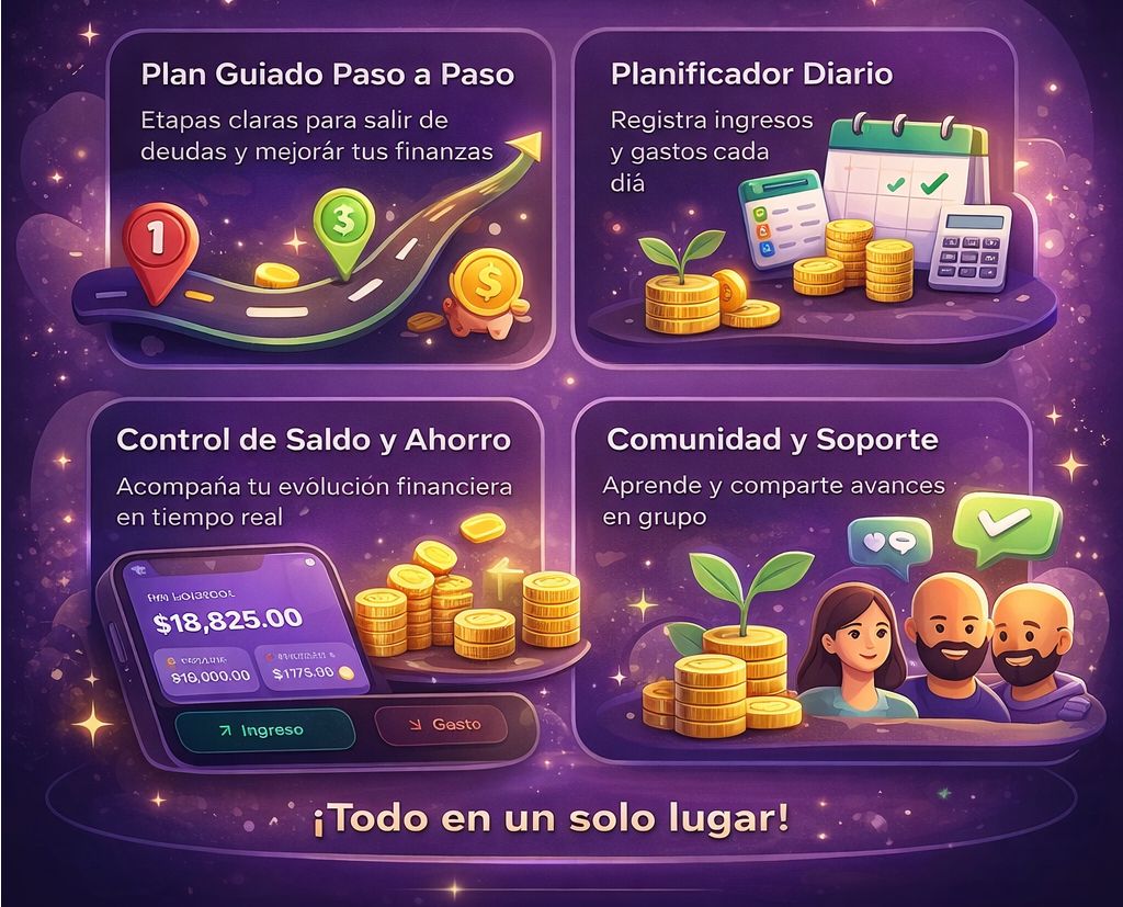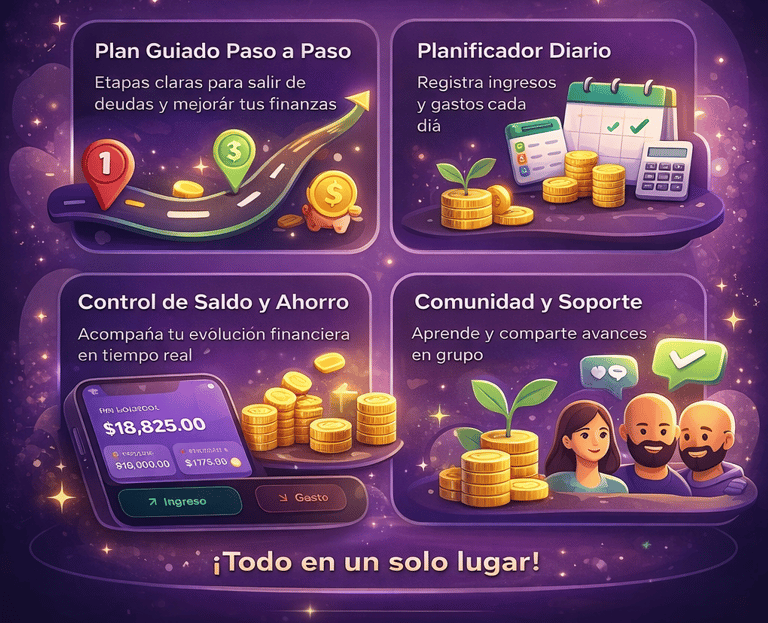 El GPS Financiero incluye un plan guiado con etapas claras para salir de deudas y mejorar tus finanzas, un planificador diario para registrar ingresos y gastos, control de saldo y ahorro, además de acceso a una comunidad donde podrás aprender, compartir avances y mantener la disciplina financiera